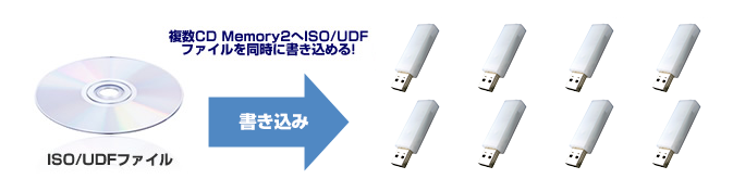 複数のCD Memory2へ同時にISO/UDFファイルを書き込みすることができるため、一台辺りの書き込み時間を大幅に短縮することができます。